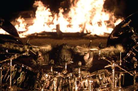 And that’s a good thing, harking back to that burning Iowa farm and those nine pissed-off musicians. Presant says that after his initial phone call from Brown, the basics of the shoot were quickly settled on; a night performance by Slipknot, whose nine members all live in Iowa, involving fire and large masks. Slipknot, in case your 15-year old has not informed you, is one of the music industry’s most celebrated hardcore metal bands, known almost as much for their extreme look as for their belligerent and chaotic performance style. All nine members wear matching dark jumpsuits and demonic fright masks that put Freddy Kruger to