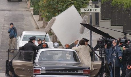 The last killing attributed to the Zodiac was the murder of a San Francisco cabdriver in a wealthy neighborhood near the Presidio. The murder was actually witnessed by three teenage siblings from their 2nd floor window directly across the street from the cab. They saw the Zodiac cut away a swath of the victim’s bloody shirt, wipe down parts of the cab’s interior and exterior, and then casually saunter away. Amazingly, the same family still lives in the Presidio Heights brownstone, and they wanted no part of reliving the tragic events. So the Zodiac team recreated the Washington and Cherry exterior in Los Angeles as a built location. The scene begins with Toschi and Armstrong approaching in their squad car, accounting for the only two shots that don’t have a digital effects component: one side of the street was shot by Savides in San Francisco, the remainder was recreated as a massive multi-block artificial set. Curbs were built with the taxicab nearby, and building facades, one for behind the cab, the other, for where the children gaze out of their window, were constructed. Complicating matters was Fincher’s desire to have the scene shot handheld. “We used blue screens as the actors moved around the cab,” Savides recalls. “The effects people from Digital Domain went up to San Francisco and used photo mapping to replace the other side of the street and both intersections. It was an amazing way to execute a night exterior where an entire street location is shown in frame, and the camera is moving. I’m sure most other filmmakers would have just locked off the camera to allow for the digital replacement.”