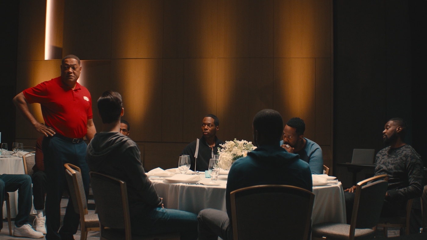 The location features prominently in Episode 5 (shot by Furmanski) and the final episode (shot by Fortner). Episode 5 features Doc alone at night fielding phone calls before Adam Silver’s press conference announcing Sterling’s fate. The lights of downtown reflected through and off the huge windows, flare into the lens as the camera retreats to another high-down shot to provide scale for Doc’s nocturnal isolation. Later, Chris Paul visits to relay the temperature of the other Clippers players (as well as their playoff opponent, the Warriors), who all want to boycott the next game. Because Fortner had shot there in Episodes 1 and 2, Furmanski says the camera, grip, and electric team were already familiar with the challenges of the location. “Number one in my mind,” Furmanski shares, “was shooting at night with those floor-to-ceiling windows and the inability to rig lights from the ceiling. Staging played an important part as we were smart about not sending actors off toward the corners in darkness. Also, Kiva’s team was very clever about hiding lights from the floor wherever they could.”