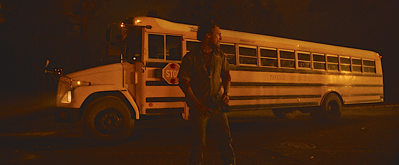 The bulk of the bus scenes was accomplished on the backlot, with McConaughey doing most of the driving. Since the fire blocked out the sun, production needed to come up with a way to keep the light consistent. “You couldn’t do silks over a long area like we needed,” describes Rokseth, “so we ended up shooting most of it at dusk, using the magic-hour vibe since there was no sun, giving us something like that weird, occluded eclipse-look light.” The DP says he sought to balance the more yellowish look of the propane flame with that of the more reddish hues associated with organic materials ablaze. “I augmented a lot of fire with tungsten light, which we used for everything. At some points, we had to have so much light to backlight the smoke to give the idea of the smoke blocking out the sun. We punched in a ton of tungsten light coming from cherry pickers and Condors. That meant our gaffer, Todd Heater, had to dust off these old Skypans, which worked great to give us the needed lighting firepower.”