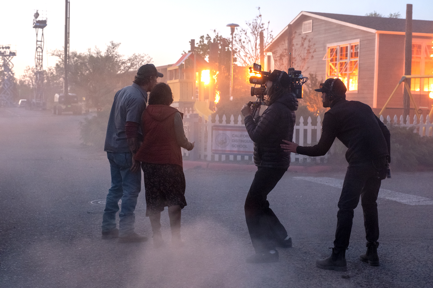 Greengrass devised a notion for a “fire POV” that became a recurring (and very effective) element in the film, portraying the fire as a voracious monster sweeping through the land. “It was a very cinematic tool to create tension,” says Rokseth, “so we used drone shots, and then Charlie did VFX work on them.” An aerial shoot over the real town of Paradise facilitated this effort. The fire POV was first previsualized. “We’d start with a virtual camera,” Noble explains, then use a real camera to give it some weight, and combine those two. The human camera had the bendy twisty stuff, and that was then fed into the CG camera, like it was an ember blowing and twisting.” The second unit also used drones close to the ground to follow the fire.